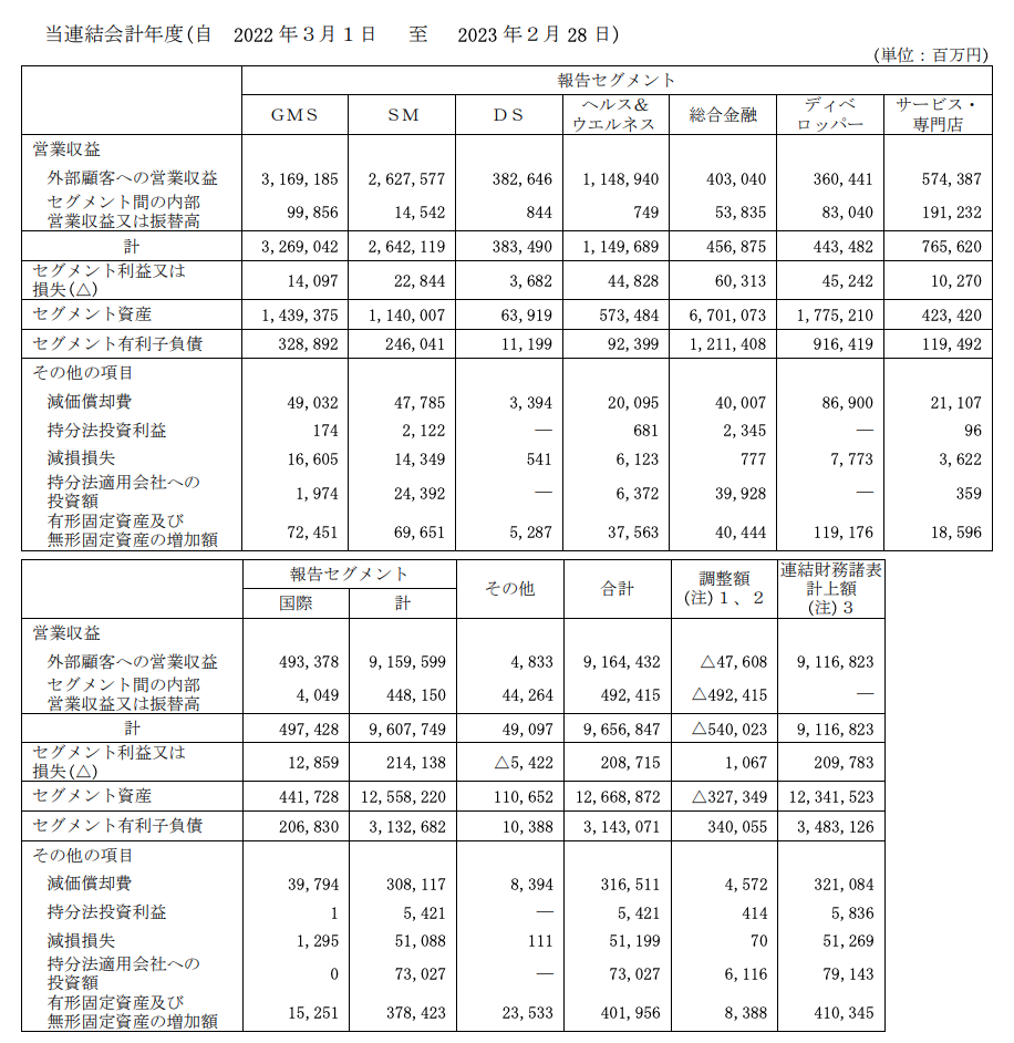 GSMというのがスーパーのイオンです。3兆円以上売り上げて、利益が140億円です。これも久しぶりに黒字化しました。SMはイオン以外のスーパーです。