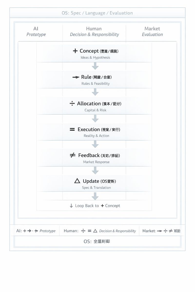 AIは+→÷を試作し、人間は÷=Δを決断し、市場は→÷≠を評価します。
