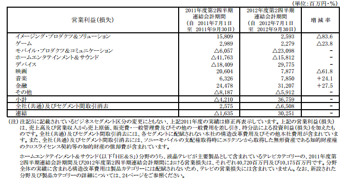 PLをまず確認しておきたい。今回のソニーの2012年第2四半期の決算短信は以下のリンク先にある。