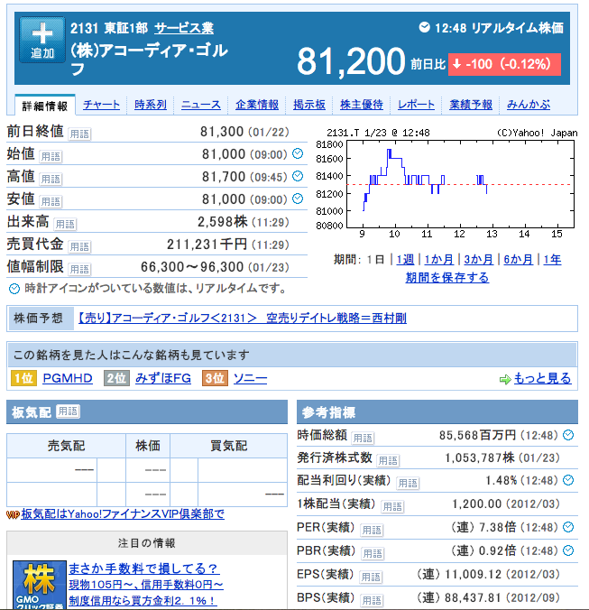 本日、平成25年1月23日付けのアコーディアの株価は以下のとおりほぼTOB価格の81,200円。時価総額が855億円。PBRが0.92倍で、PERが7.38倍である。