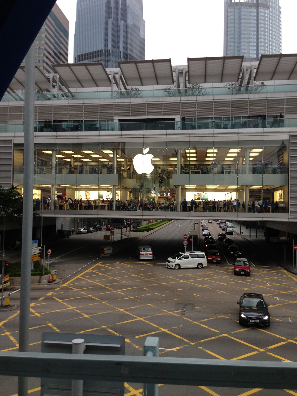 とにかく、スゴイ数の中国人の方が高級ブランドを買いに来ています。ヴィトン、プラダ、エルメスのような店は行列で入場制限。彼らにインタビューすると、中国国内では偽物を掴まされる可能性が高いので、香港などで買い物をするそうです。以下はアップルストアですが、サイズも大きいですし、すごい人数がお店にいます。