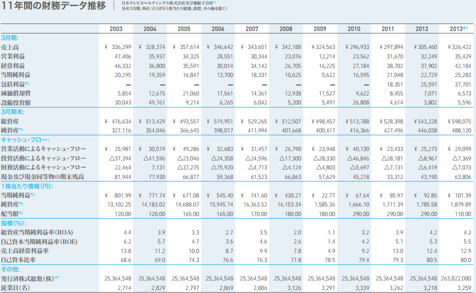 日テレの業績を確認すると、イメージとは異なり、増収増益のようだ。アニュアルレポートのP.2を以下に引用する。