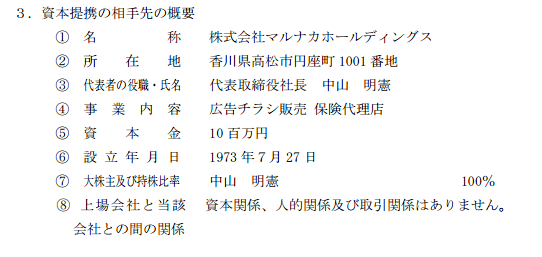 マルナカホールディングスについては、このブログで述べた記事を多くの方に読んでいただいた。この記事はマルナカがイオンに譲渡された際の記事なので、直接関係がないかと思って、あらためて当時のブログを読み返していると、 このイオンとマルナカとの資本提携は、契約当事者がマルナカホールディングスとなっている。ただし、資本金10百万円の広告チラシ販売、保険代理店が事業内容であり、今回問題になっている不動産業とは無関係の会社のはずだ。