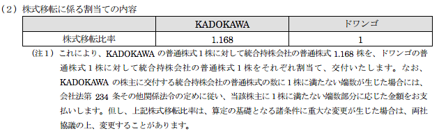 その結果、角川29,258,393株(平成26年3月末)、ドワンゴ 40,810,400株(平成26年3月末)の発行済み株式に対して、角川株に対しては1株あたり1.168株、ドワンゴについては1株につき、1株を持つことになる。
