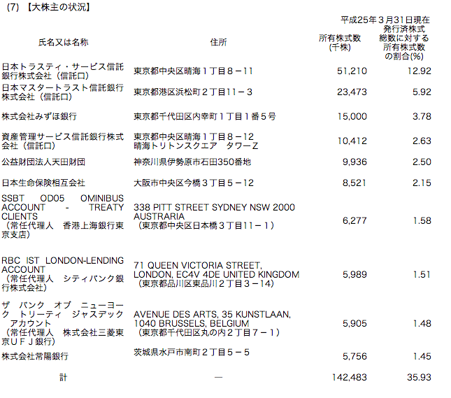 オーナー企業であれば、配当をしても、その配当の多くがオーナーに入るということもあるが、EDINETで昨年度末の株主を確認すると、以下のとおり、特定の個人ではなく信託口、金融機関が大株主となっており、配当が経営者等の個人資産を増やすということもなさそうだ。
