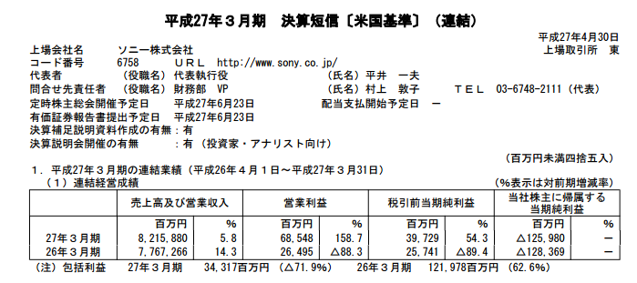 ○ソニー平成27年3月期 決算短信〔米国基準〕(連結)