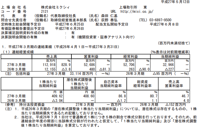 ○株式会社ミクシィ 平成27年3月期 決算短信〔日本基準〕(連結)