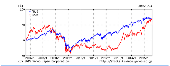 以下のヤフーファイナンスで、10年間のニューヨークのダウと日経平均の比較グラフをとってみた。
