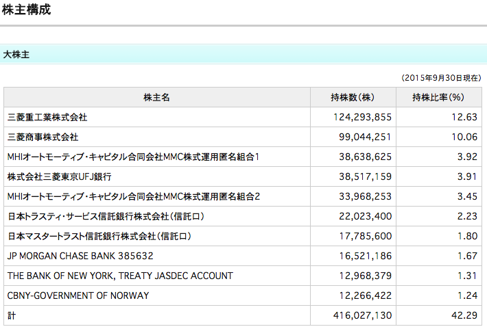直近の三菱自動車の株主構成を見ておきましょう。このうえに、34%の日産が入るわけですが、過半数をとるには、日産と重工、商事など三菱グループの合意が必要となります。三菱グループを出るわけではないので、三菱ブランドが維持される可能性は高いでしょう。